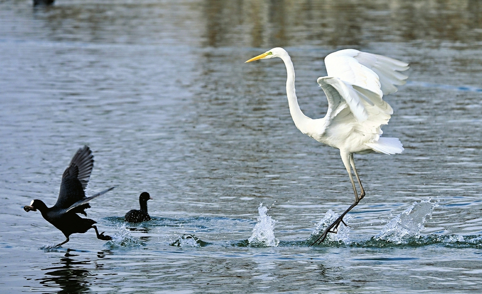 11月27日,太原汾河湿地公园,成群的白鹭、白骨顶鸡和凤头鸊鷉在水中游弋,时而追逐嬉戏,时而争抢食物,为冬日景区增添了勃勃生机。