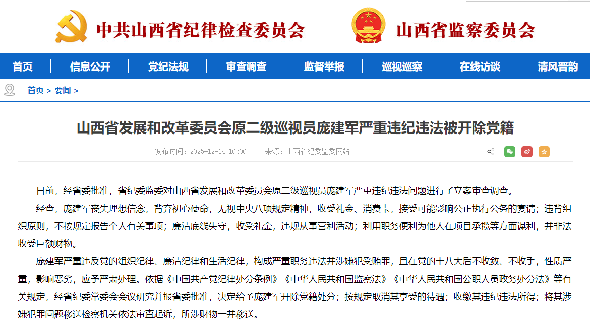 日前,经省委批准,省纪委监委对山西省发展和改革委员会原二级巡视员庞建军严重违纪违法问题进行了立案审查调查。