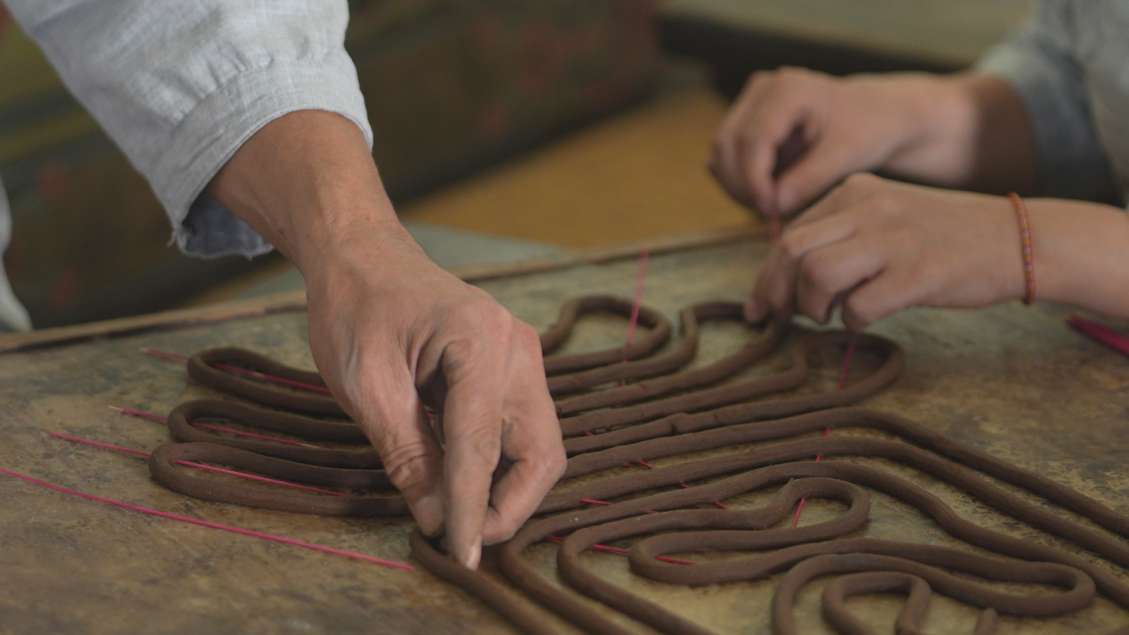 “制作香泥可是一门绝活儿。看起来跟平时和面一样,可云香质量的好坏,全凭匠人手里练出来的功夫。”山西省级非遗交城云香制作技艺第五代传承人米珍介绍说,揉制的香泥要软得能绕指,韧得拉成丝,经模具挤压成香条,才能进入盘香环节。在云香匠人手中,“福”“禄”“寿”“喜”等十数种体现吉祥寓意的字样,无需借助任何模型就能一气呵成。
