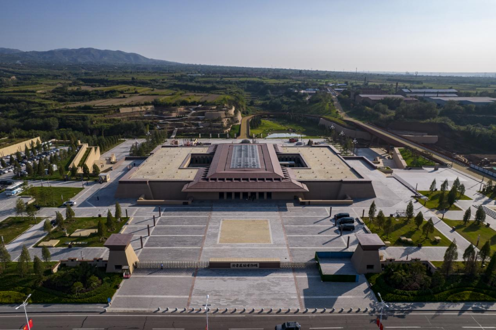 从空中俯瞰陶寺遗址博物馆,外观设计呈现一个“中”字。(资料图)新华网发 (王梓轩 摄)