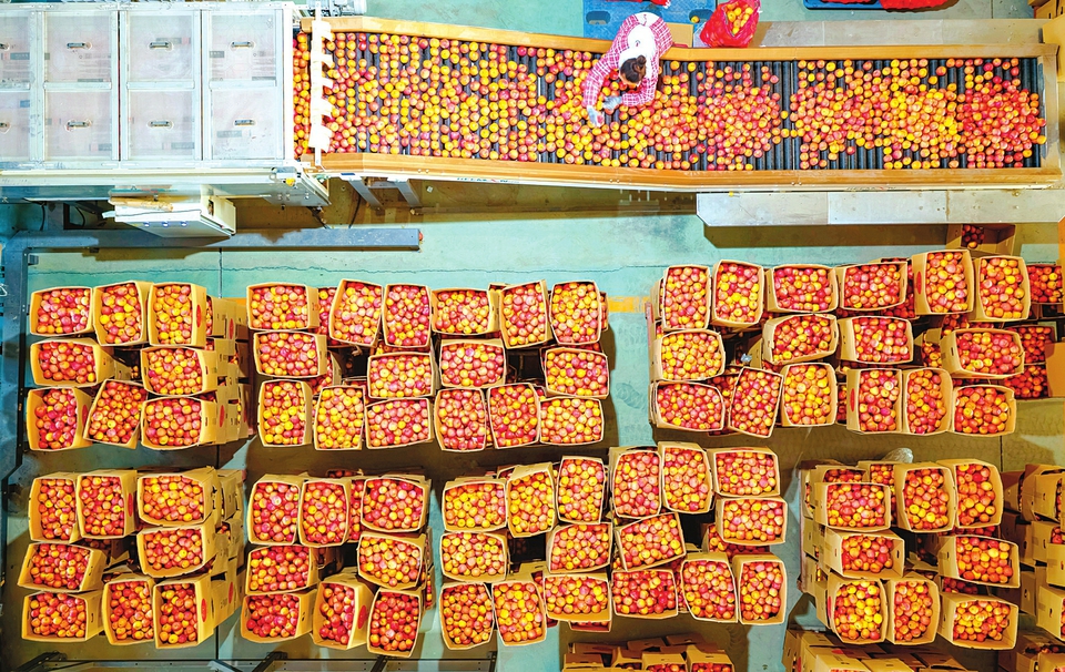 万荣县恒源果业有限公司员工在包装产品,准备发往国外市场。