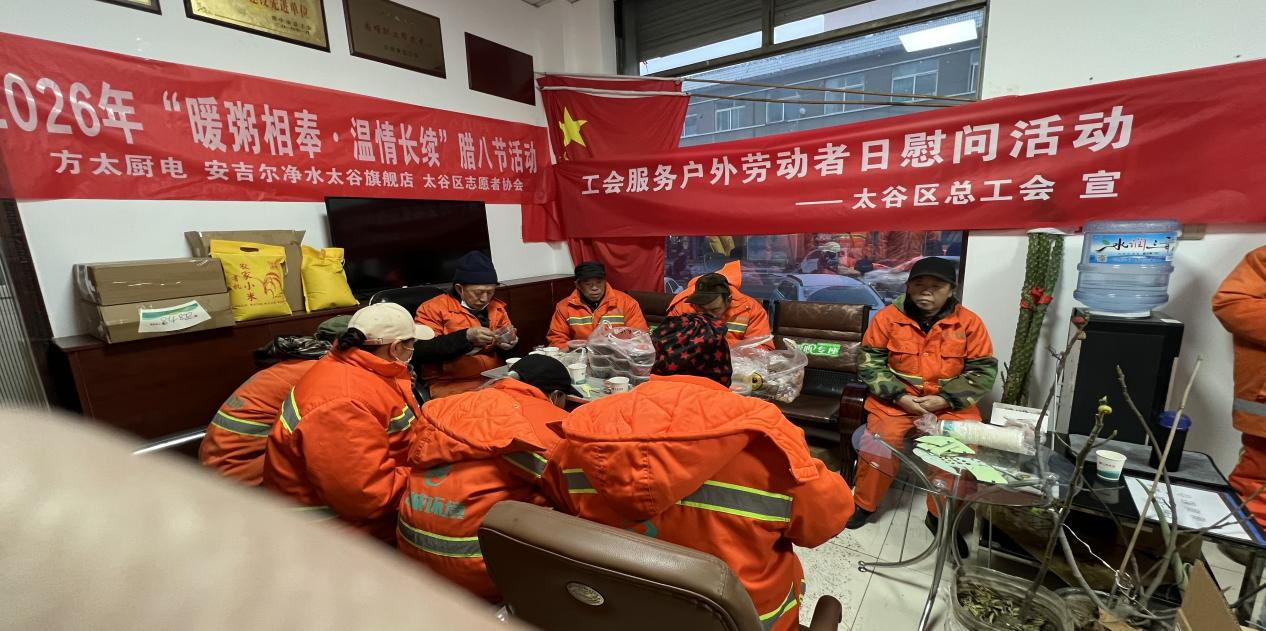 此次活动中,晋中市太谷区总工会将800余碗温热腊八粥、1600块太谷饼,送到环卫工、园林工、外卖小哥、快递员等户外劳动者,以及公安干警、消防救援人员、医护工作者等值班人员手中,为寒冬里的城市守护者们送上真挚的节日关怀。
