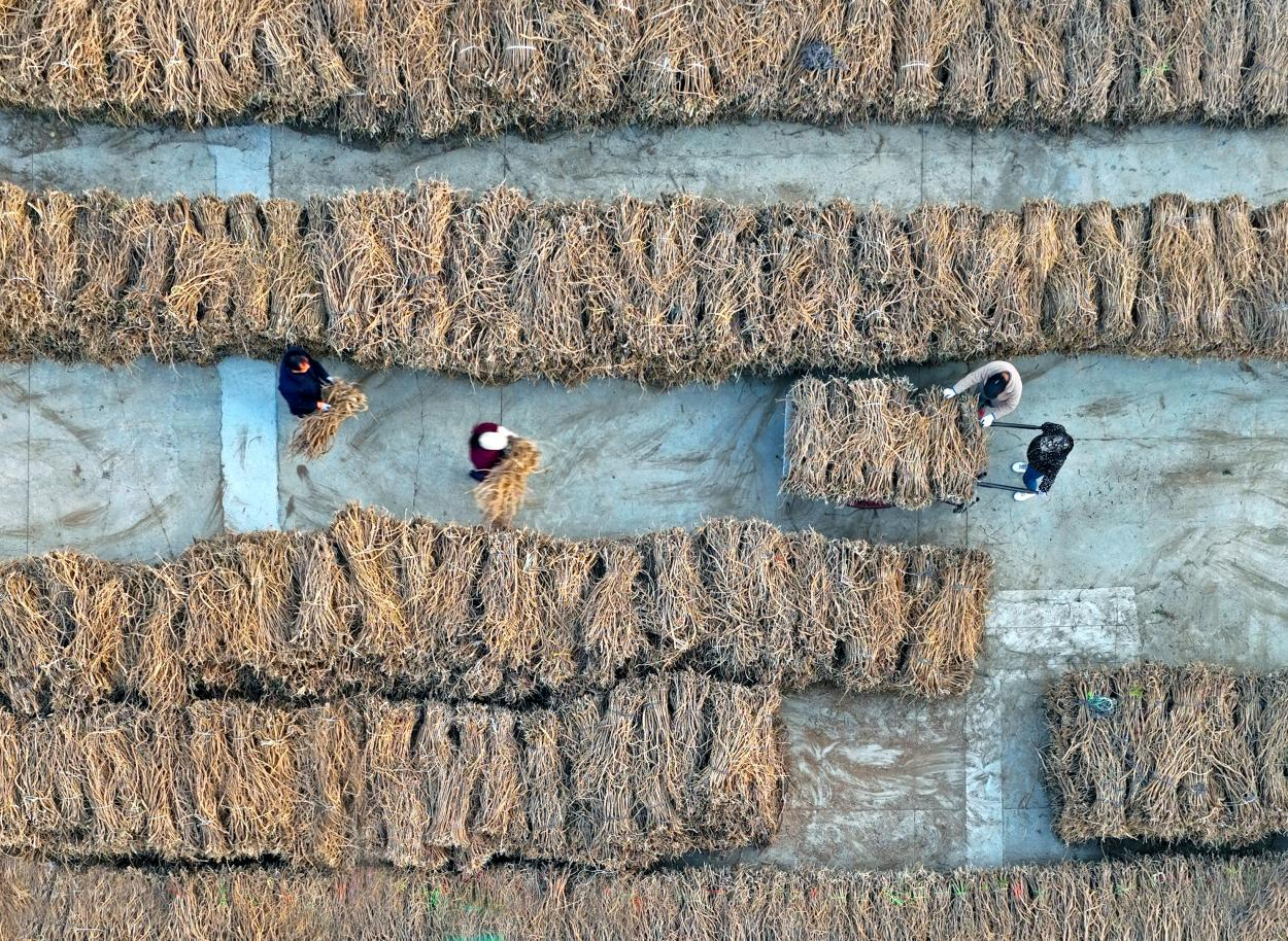 工人们将黄芪切片。(宋佳烨 摄)
