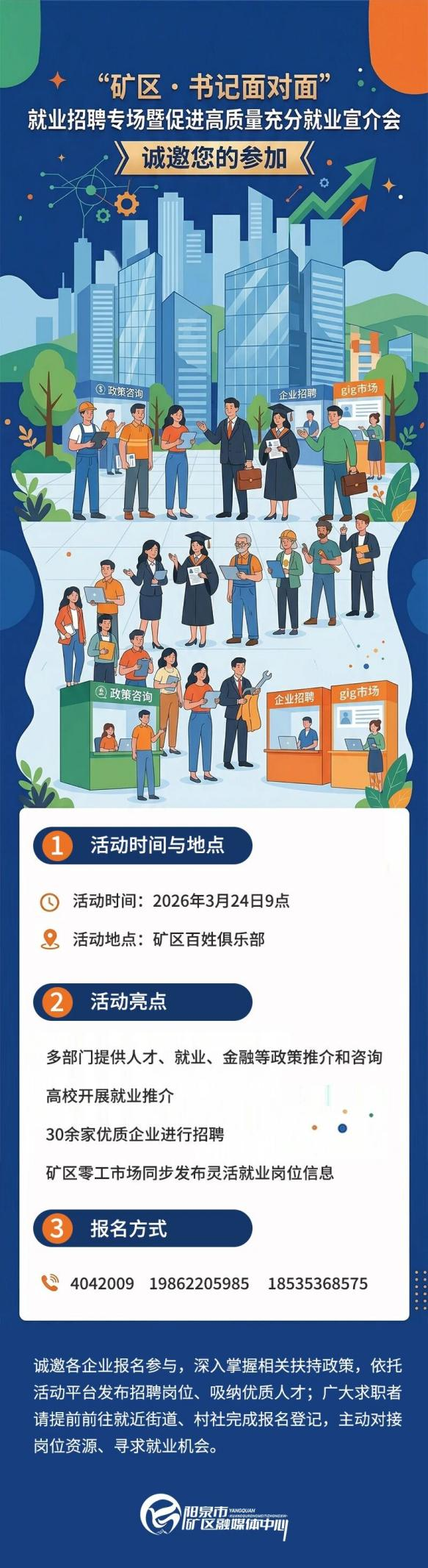阳泉市“矿区・书记面对面”就业招聘专场暨促进高质量充分就业宣介会将于3月24日走进矿区百姓俱乐部。届时,将有30余家企业进行招聘,多部门提供人才、就业、金融等政策推介和咨询。