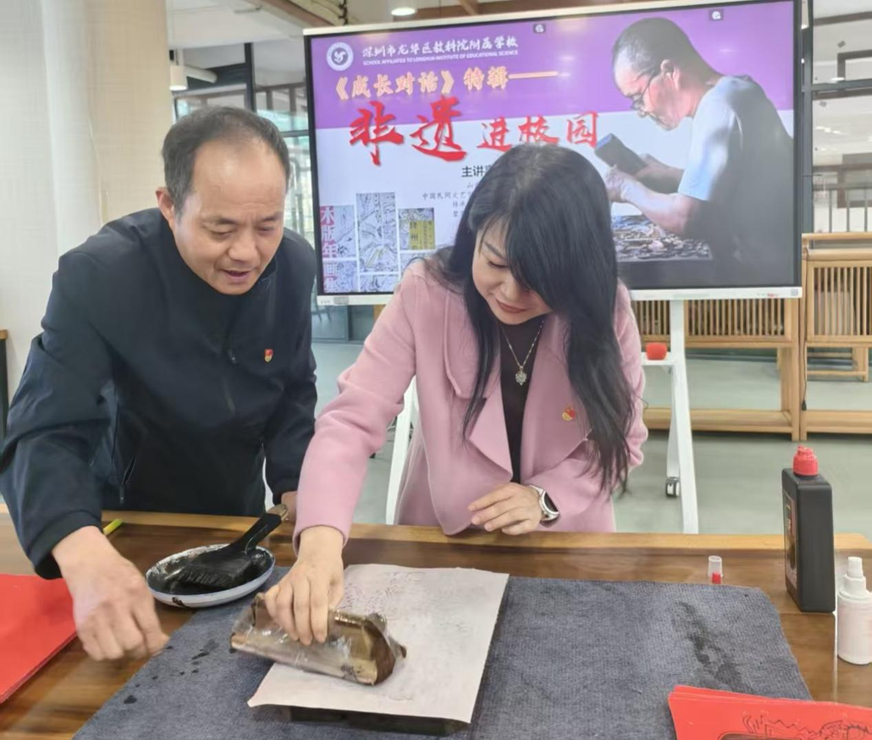 近日,深圳龙华区教育科学研究院附属学校的美术教室里,墨香与木韵交织,山西省非遗绛州木版年画省级传承人郭全生,正手把手指导孩子们印制年画。