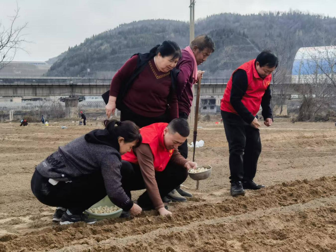柳林县穆村镇党委组织党员干部在田间地头开展紫皮蒜种植田间培训,老党员现场手把手传授种植技巧,青年干部全员上手翻地播种,助力春耕备耕。