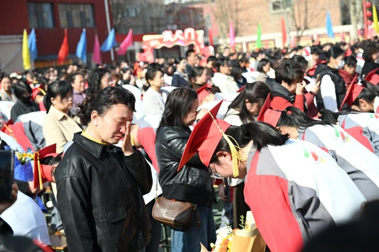 冠礼仪式庄重开启,家长与师长为学子们佩戴成人帽、整理衣襟,学子们向父母、师长深深鞠躬,感恩养育与教诲,现场温情涌动。