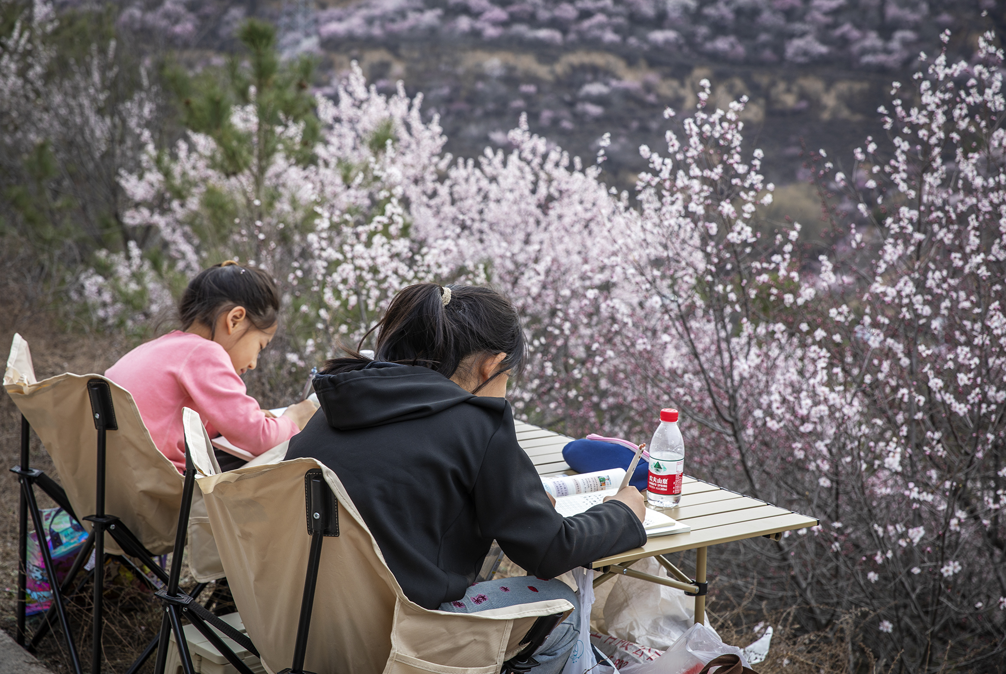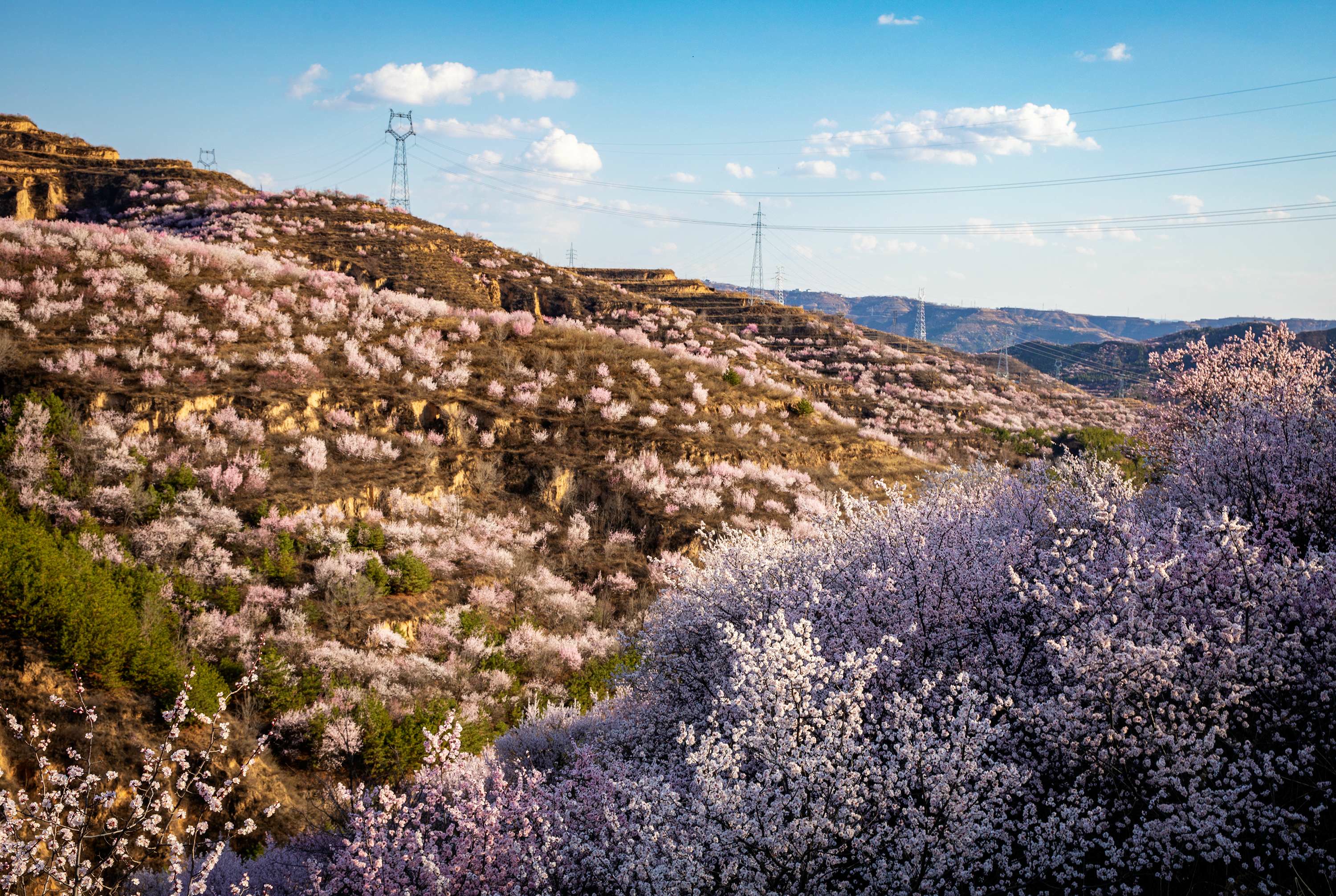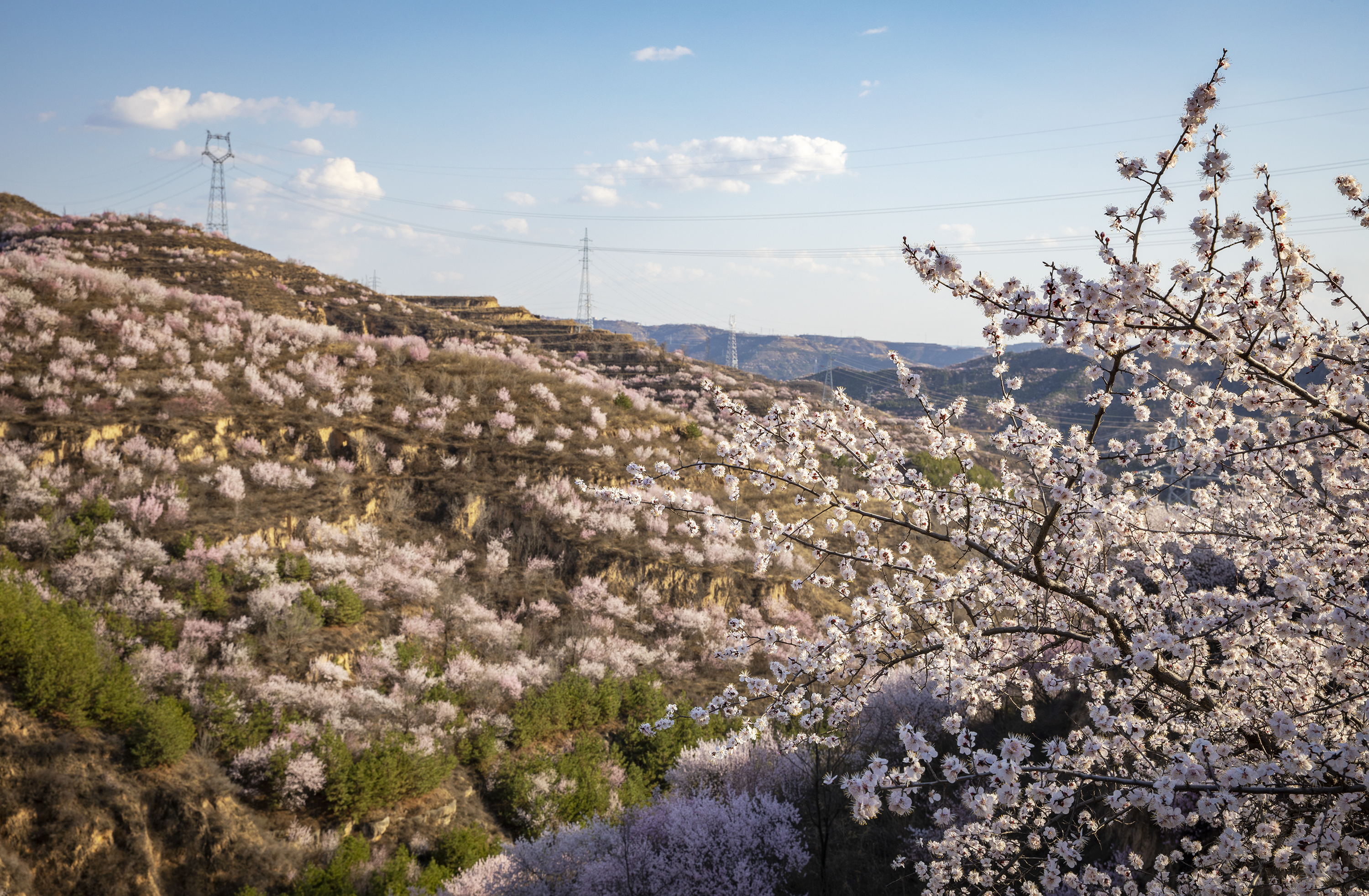春日晴空下,于家沟村的山坡被粉白桃花“泼墨”成画。