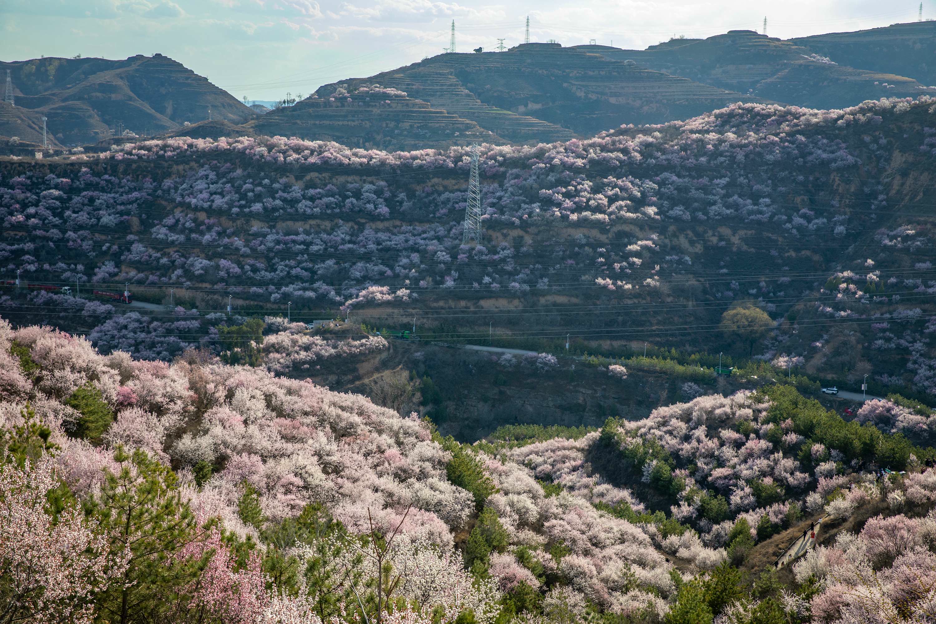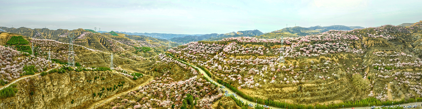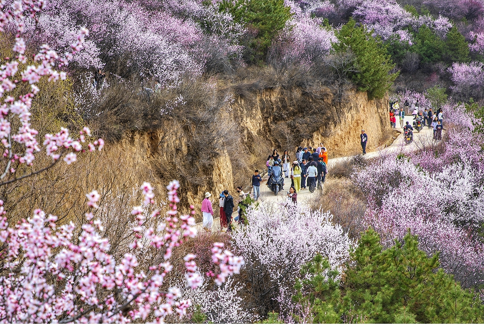 于家沟村的山坡上,粉白桃花铺满山峦。