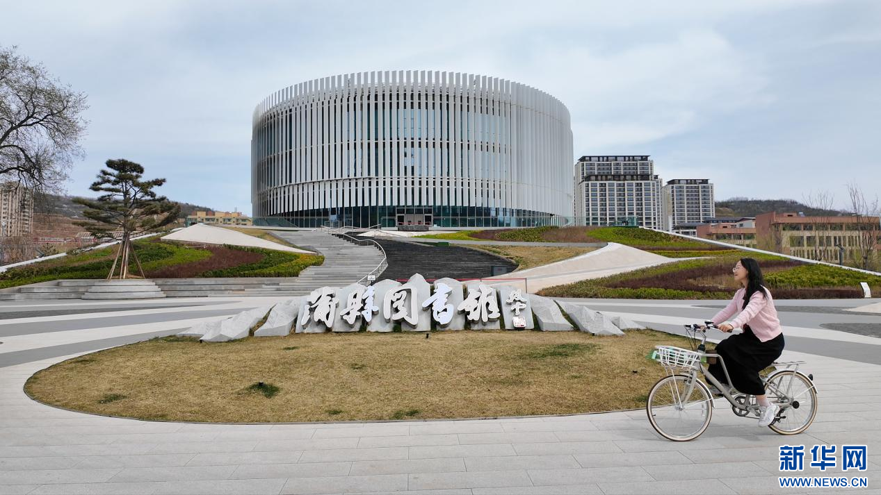 4月2日,一名游客骑车经过蒲县图书馆。新华网发(陈慧忠 摄)