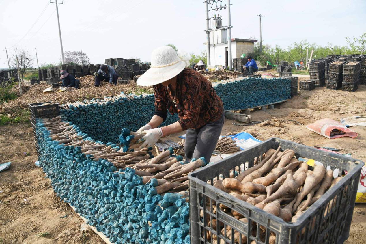 近日,在山西省运城市闻喜县郭家庄镇宋店村千亩山药种植基地,规整田垄绵延成片,优质山药种薯整齐排布,农户们分工协作、有条不紊开展播种、扎架等农事作业。