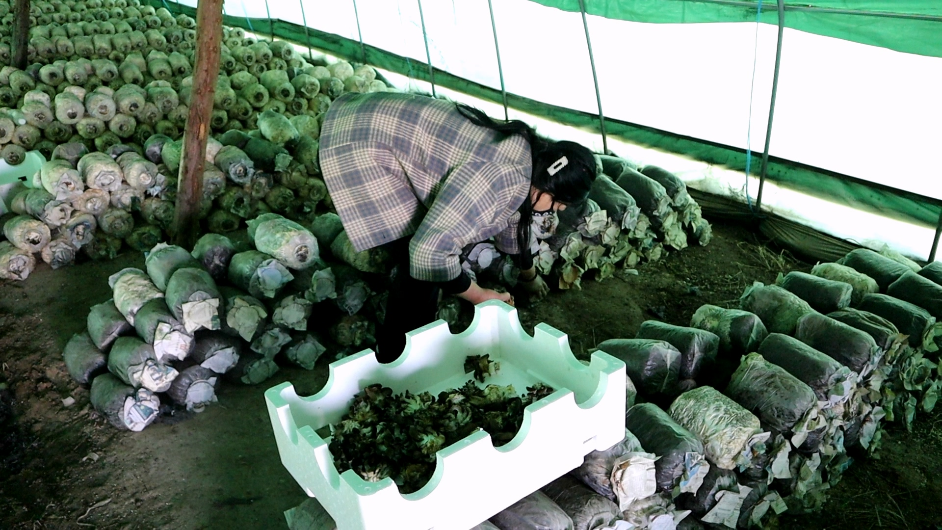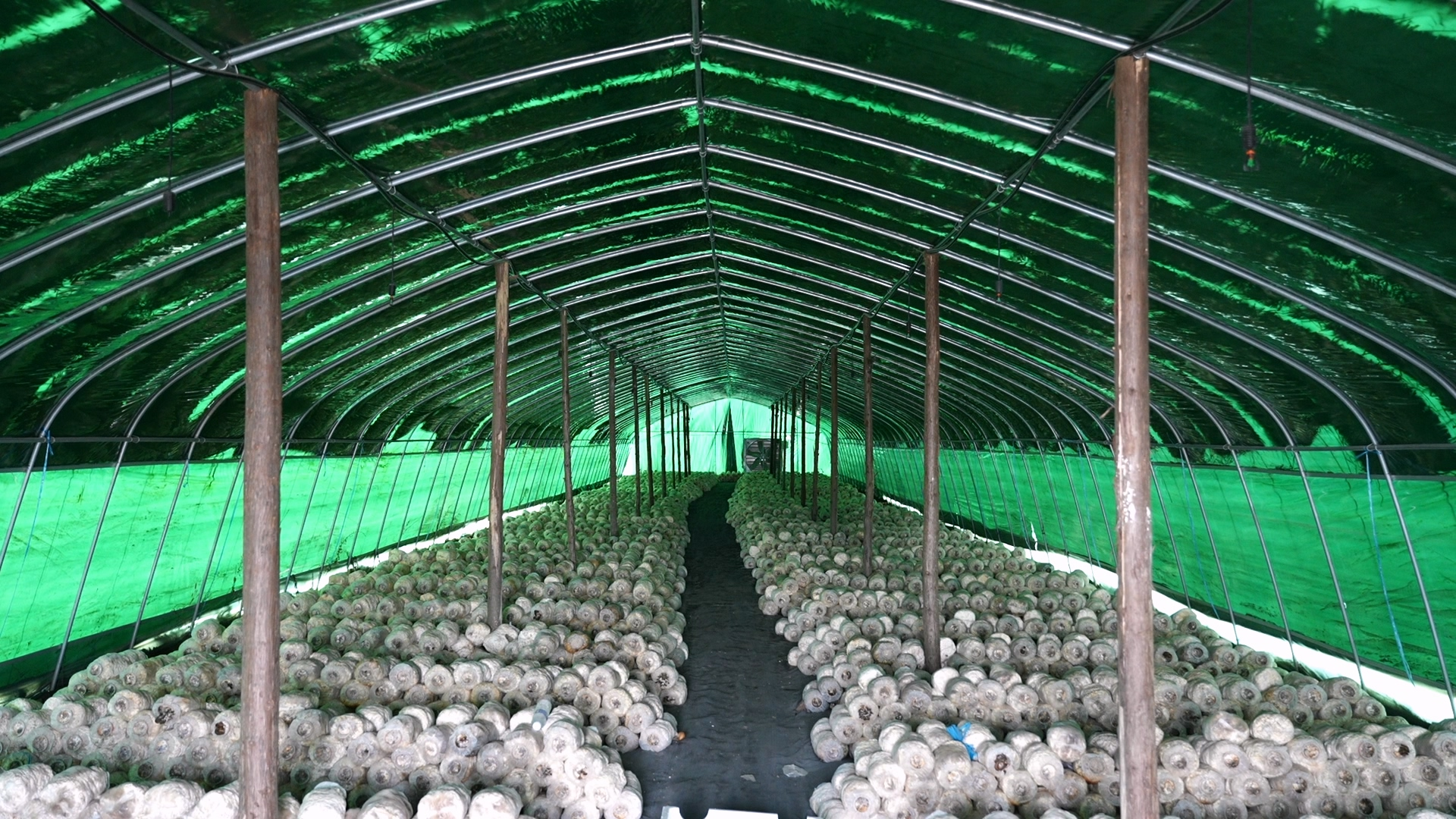 棚内村民们分工协作,规整摆放新到的菌棒,确保间距合理、通风顺畅;巡查棚内环境,记录温湿度数据;清理棚内杂物,做好卫生消杀,全程严格按照菌菇培育技术规范操作。
