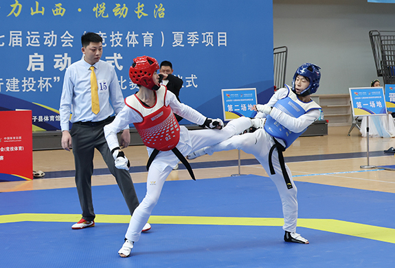4月19日,山西省第17届运动会跆拳道比赛在长治市长子县体育馆开赛。第一个比赛日战罢,太原市选手刘雨鑫、武筠朔包揽甲组女子68公斤级冠亚军。