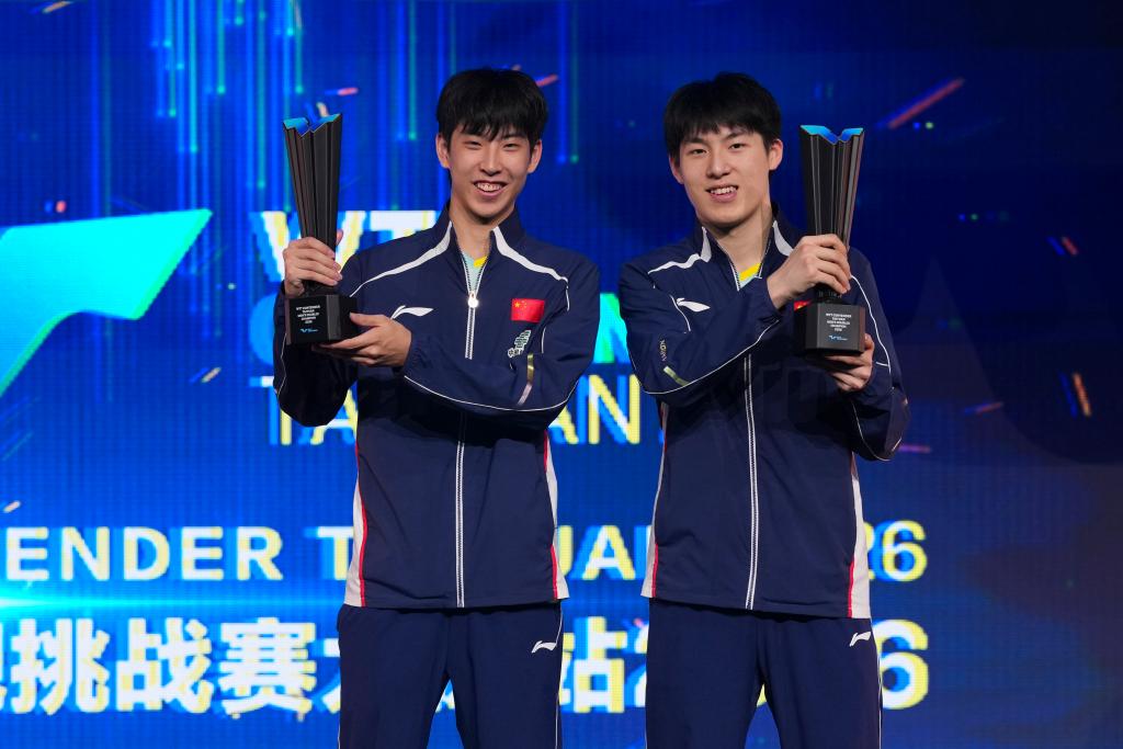 新华社照片,太原,2026年4月12日 4月12日,冠军中国组合李和宸(左)温瑞博在颁奖仪式上合影。 WTT常规挑战赛|李和宸/温瑞博男双夺冠