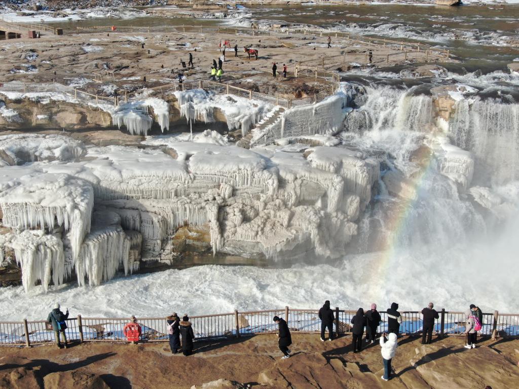 新华社照片,吉县(山西),2026年1月6日 1月6日在山西吉县黄河壶口瀑布景区拍摄的“冰瀑玉壶”和彩虹景观(无人机照片)。