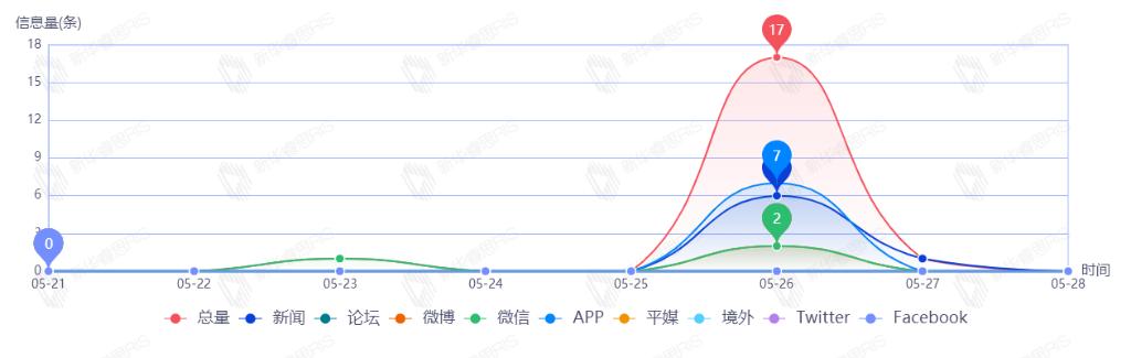 截至目前,该文章在互联网上传播总量19篇。其中5月26日是传播的高峰期,共传播17篇文章。各信源的信息发布情况中,新闻信息占比最大,其次是APP和微信,占比分别为36.84%、36.84%、15.79%。(数据来源:新华睿思数据云图分析平台)