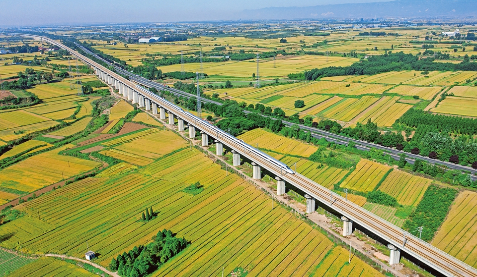 芒种时节,襄汾县68.3万亩小麦陆续进入成熟收割季节,麦田里一望无际金黄色的麦穗随风摇摆起舞,与田间的高铁、公路相映成趣,一幅丰收画卷正徐徐展开。图为6月8日在襄汾县景毛乡北古县村附近拍摄的麦田景象。(李现俊摄)