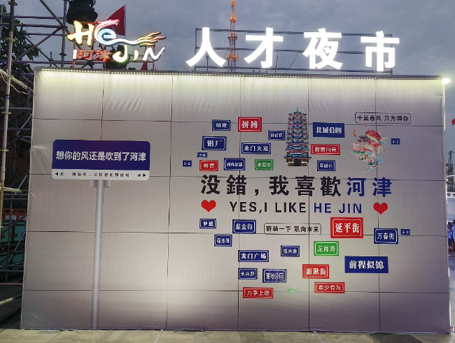 招聘现场设立了“人才夜市”,为企业与求职者搭建供需平台,更好地引导和促进各类求职人员就业;设置了“政企才面对面”会客厅,空间功能划分为商谈洽谈区、人才优惠政策解读区、免费茶水供应区及打印复印服务区,为企业、人才提供进一步洽谈的空间。招聘会场北侧设置的“人才打卡墙”,由或长或短发光字体组成,增添了河津街道名称、河津景点名称等元素,吸引了不少群众驻足打卡。