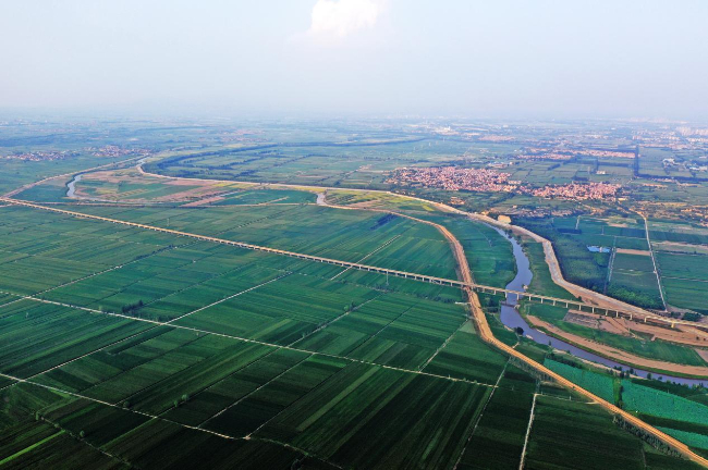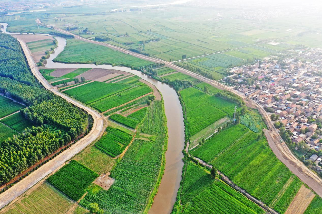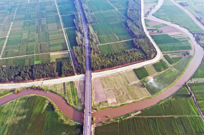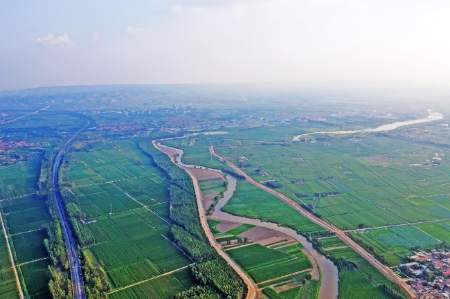 汾河新绛段与高速公路、田园相映成趣。(高新生 摄)