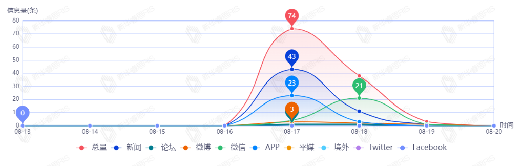 截至目前,该文章在互联网上传播总量115篇。其中8月17日是传播的高峰期,共传播74篇文章。各信源的信息发布情况中,新闻信息占比最大,其次是微信和APP,占比分别为47.83%、22.61%、22.61%。(数据来源:新华睿思数据云图分析平台)