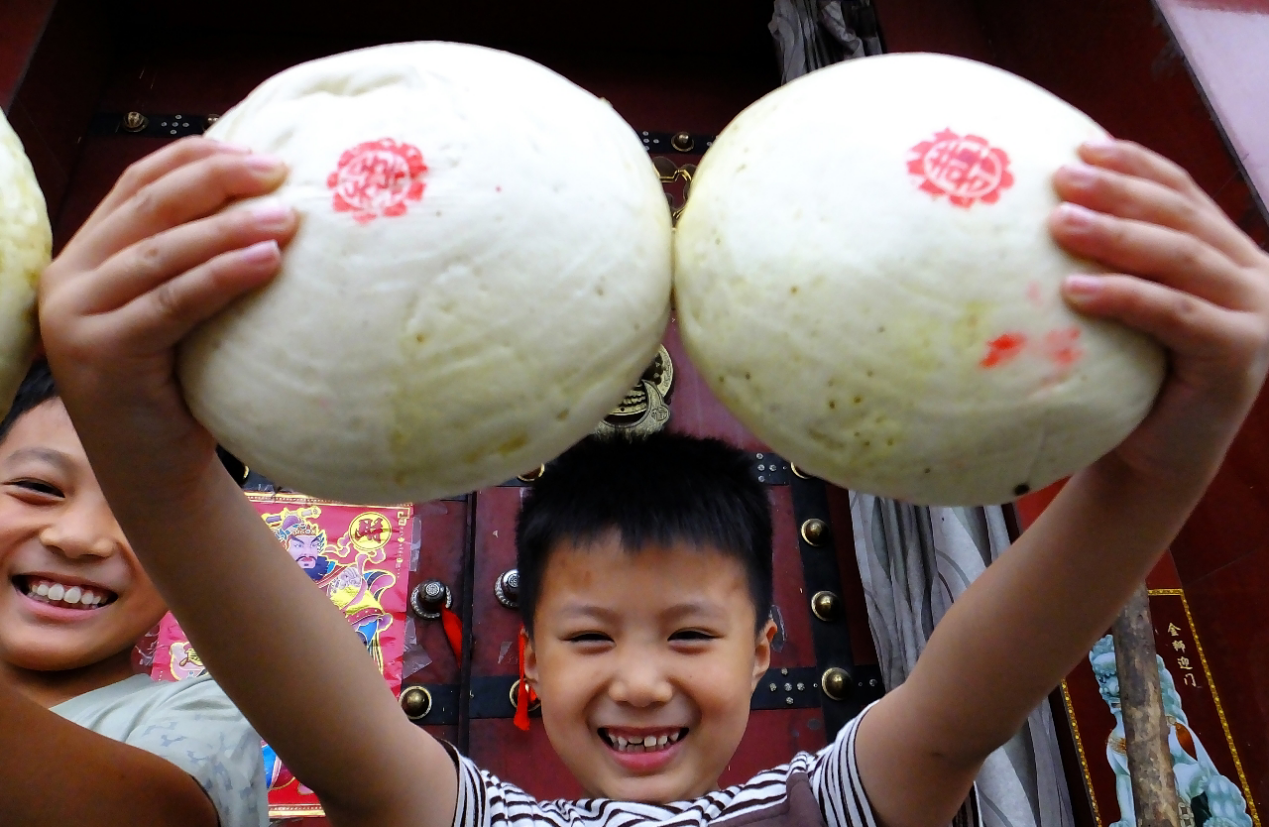 孩子们展示晋南月饼花馍。(高新生 摄)