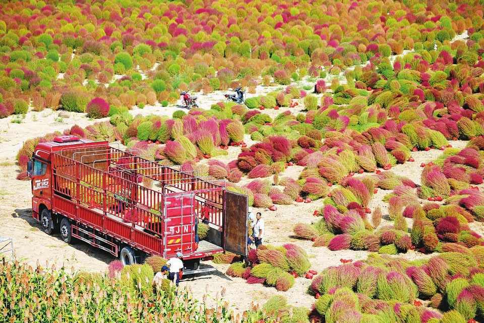 9月30日,柳林县曹家沟村扫帚草种植基地迎来丰收季,村民们忙着收割、装袋、搬运扫帚草,准备运往浙江。近年来,该村党支部依托合作社带领村民发展扫帚草种植产业,年产值达60万元。