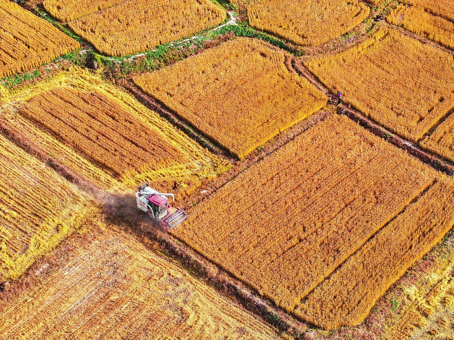 10月28日,农机驾驶员在平遥县岳壁乡梁村收获水稻。近年来,该村立足自然资源特点,注重科技兴农,改良水稻品种,实施科学、绿色、健康种植和管护模式,助力农民增收。(梁生仁摄)