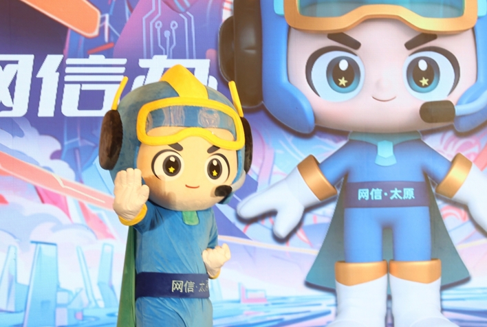 活动中,太原市委网信办IP形象——“并小信”首次亮相。“并小信”整体形象为安全小卫士,贴合网信办职能而设定。蓝色战衣和头盔象征着纯净如蓝海的互联网环境,白色手套和战靴寓意着公正、纯洁、健康的网络空间,绿色披风代表着绿色的网络生态,胸口的盾形标志代表对网络安全的守护。整体配色以蓝白双色为主,科技感十足。
