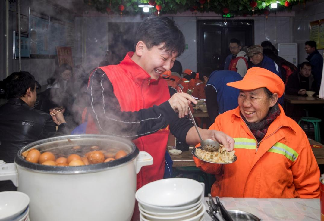 在早餐店,志愿者为环卫工人端上热气腾腾的腊八粥、鸡蛋、稀饭和烙饼。