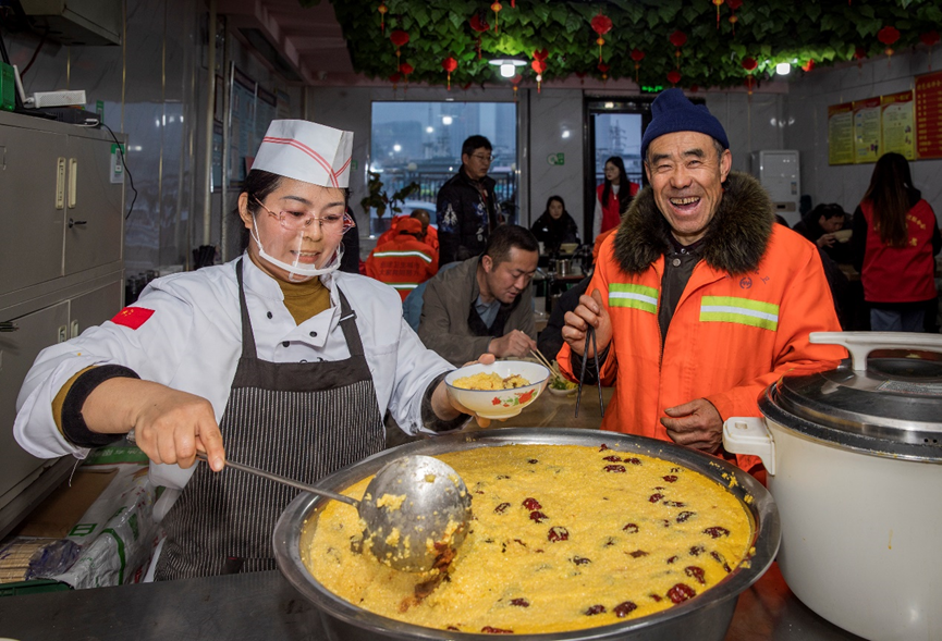 1月18日是腊八节。一大早,山西省吕梁市柳林县青龙蝉明特色烙饼早餐店工作人员将熬制的腊八粥送到环卫工人手中,迎接“腊八节”。