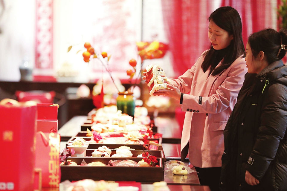2月1日,在晋中迎喜房的花馍展区,顾客正在选购商品。“小年”前后,花馍在该市热销。(唐伟青摄)