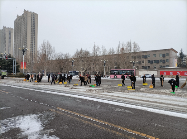 尧都区各机关企事业单位党组织和广大党员干部职工利用扫帚、铁锹等工具,对各自责任区内的重点路段进行清扫。同时,各乡镇(街道)组织党员干部、志愿者、群众开展清雪破冰行动,对辖区内主干路、陡坡急弯以及积雪严重、群众出行较多的路段采用“人工+机械”方式,及时进行清扫清理,保障道路通畅、群众出行安全。