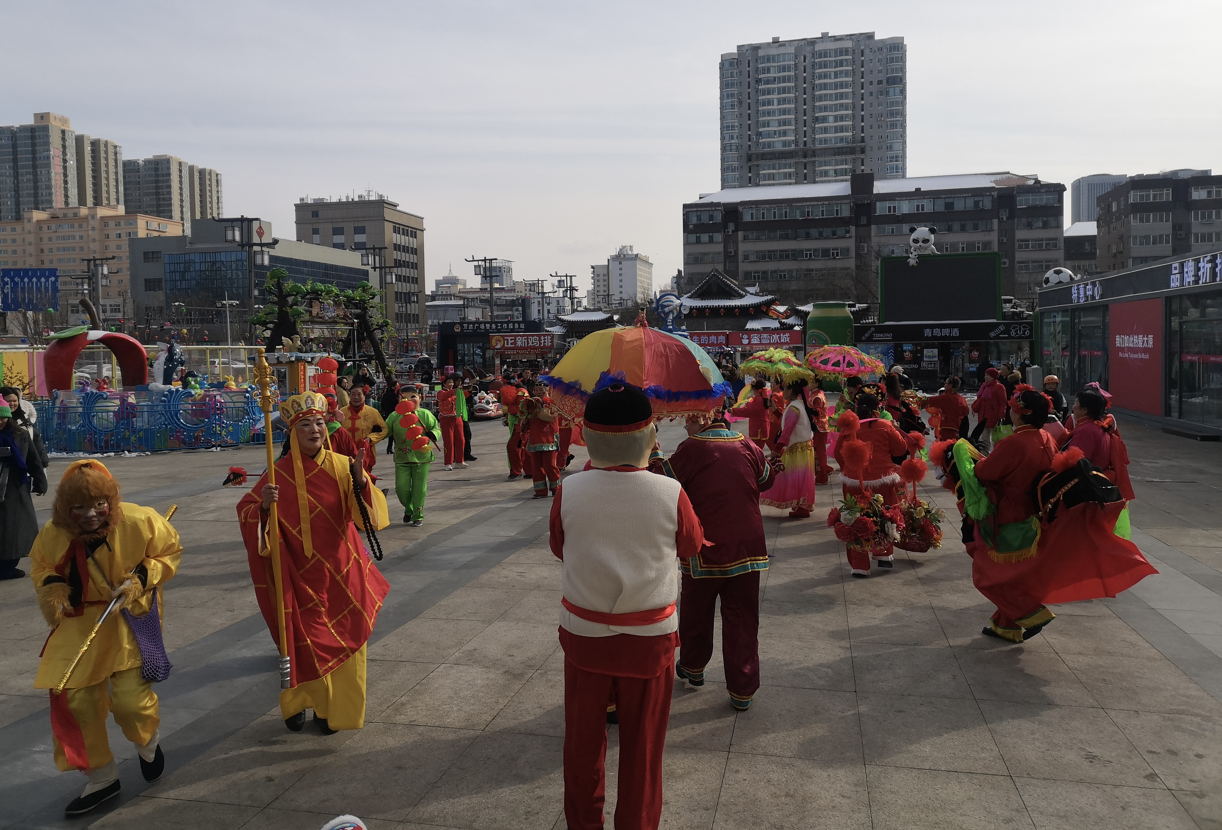 2024年元宵节期间,传统民俗舞龙、舞狮、锣鼓、秧歌、舞龙带表演在太原市杏花岭区万达广场、泰享里、多彩城、富力广场、山西特产中心五大商圈轮番上演。