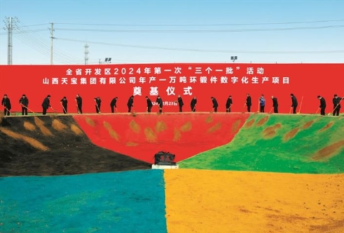 图为全省开发区2024年第一次“三个一批”活动忻州市“开工一批”重点项目——山西天宝集团有限公司年产1万吨环锻件数字化生产项目奠基仪式现场。 本报记者 范 涛摄