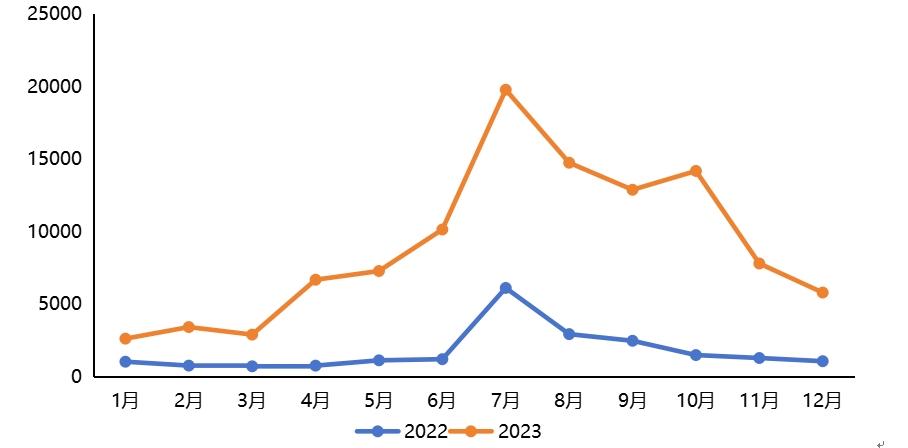 2022年、2023年大同文旅品牌传播量(单位:条)