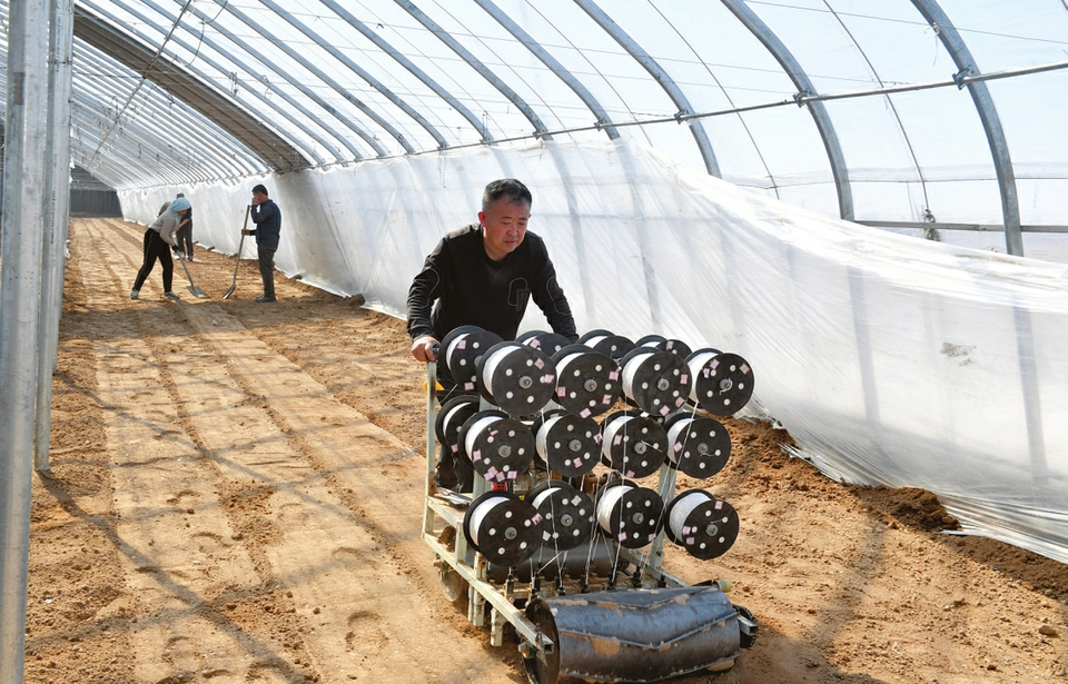 在定襄县季庄镇邱村的智能温室大棚里,刘文治利用铺种机将一根根种绳埋入土中。郭婧蕾摄