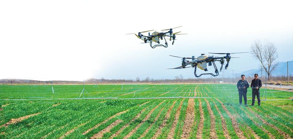 图为在运城市盐湖区解州镇曲村农业科技示范基地,农技人员操作植保无人机对麦田开展春季除草作业。闫鑫摄