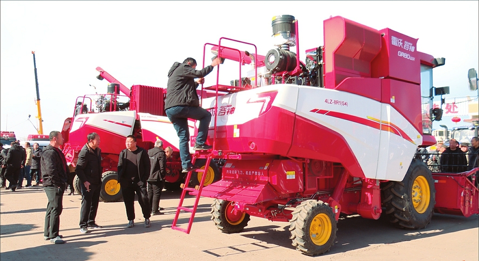 图为在祁县的农机市场里,农户们正在了解新农机。通讯员摄