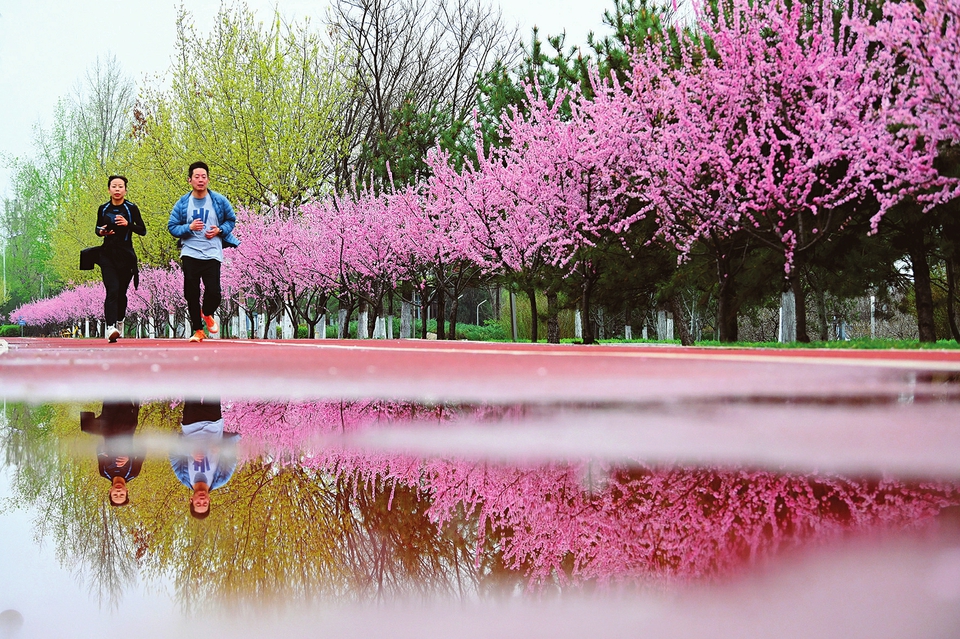 4月3日,太原汾河景区,市民正在鲜花盛开的岸边跑步健身。春日的太原汾河景区,繁花似锦,春意盎然,两岸全长75公里的滨河自行车道及周边,从绿化到彩化,从单一的生态景观到人文的观赏景观,勾勒出一幅人与自然和谐共生的动人画卷。(记者李兆民摄)
