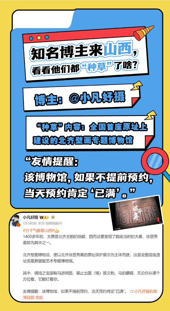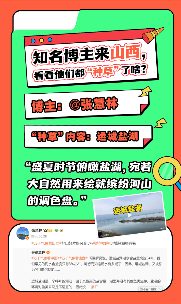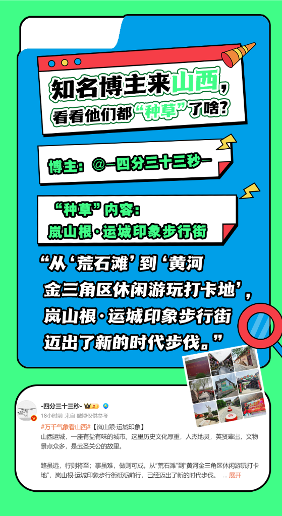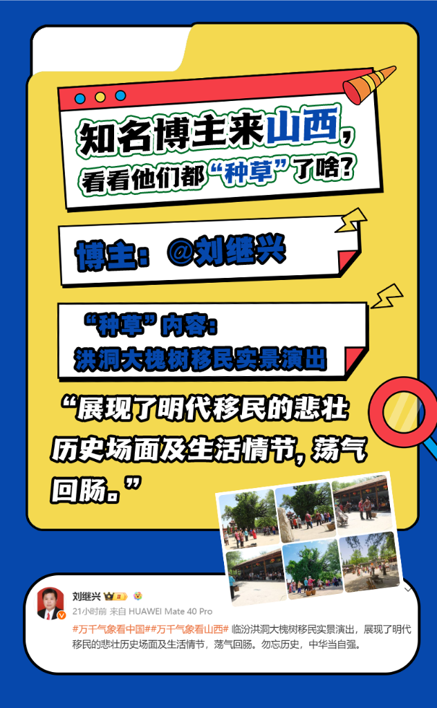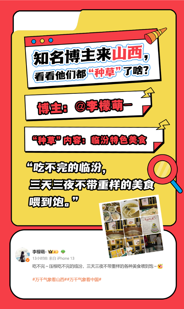 在近日举办的“中国式现代化的万千气象”网络名人山西行活动中,来自全国的知名博主相聚山西,共同见证山西现代化的发展成果。通过一组海报,看看他们都“种草”了啥