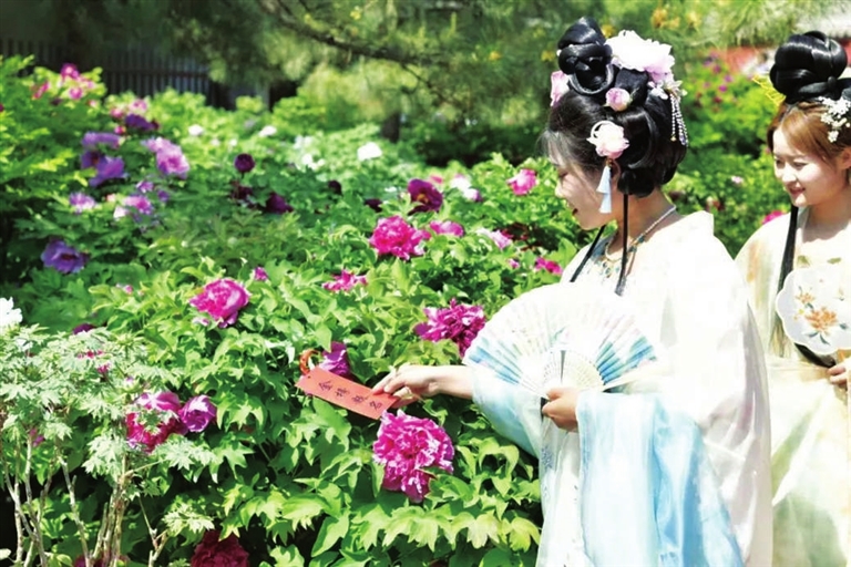 4月25日晋祠牡丹节开幕,游客身着唐装流连花间。