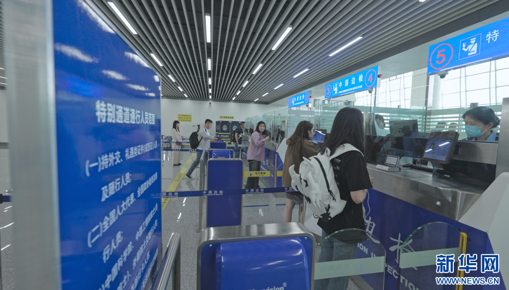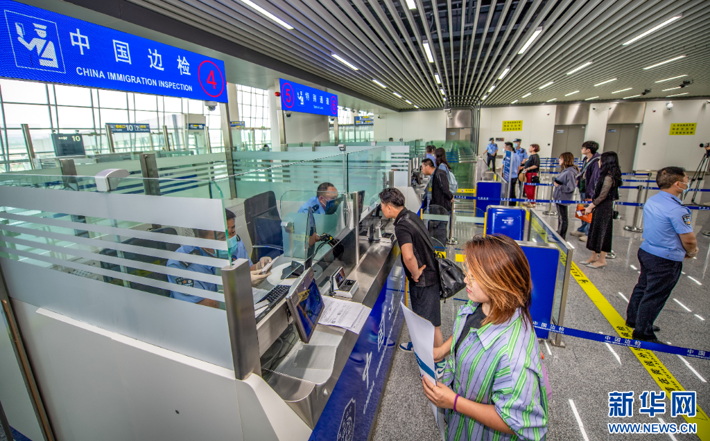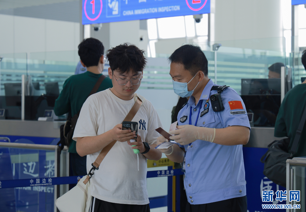执勤民警为旅客办理出境手续。新华网 发