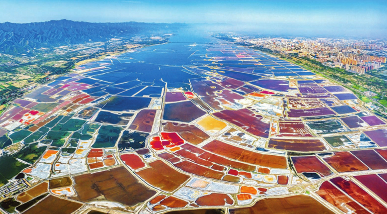 6月12日,运城七彩盐湖景区色彩斑斓,美不胜收。近日,运城市持续出现高温天气,七彩盐湖随着温度的变化,呈现出更加绚丽的景色,空中俯瞰,宛如巨型调色板。(薛俊摄)