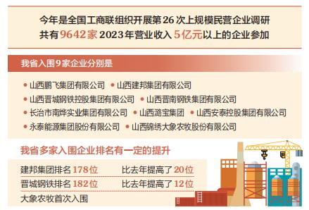 10月12日,全国工商联发布2024中国民营企业500强名单。山西9家民营企业榜上有名,数量比去年增加一席。
