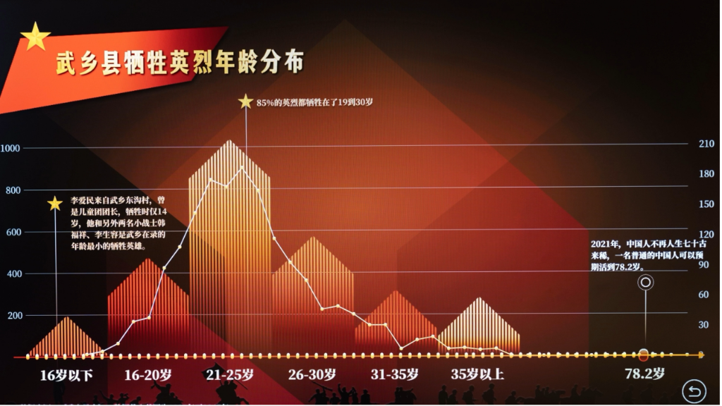 叶健介绍说,“85%的武乡烈士牺牲于19到30岁之间,最小的烈士仅14岁,而这些只是留下姓名的烈士。”他们在最美好的年华投入到保家卫国的战斗中,牺牲时,风华正茂。正是有了先烈们的浴血奋战,才有了如今幸福安稳的生活。