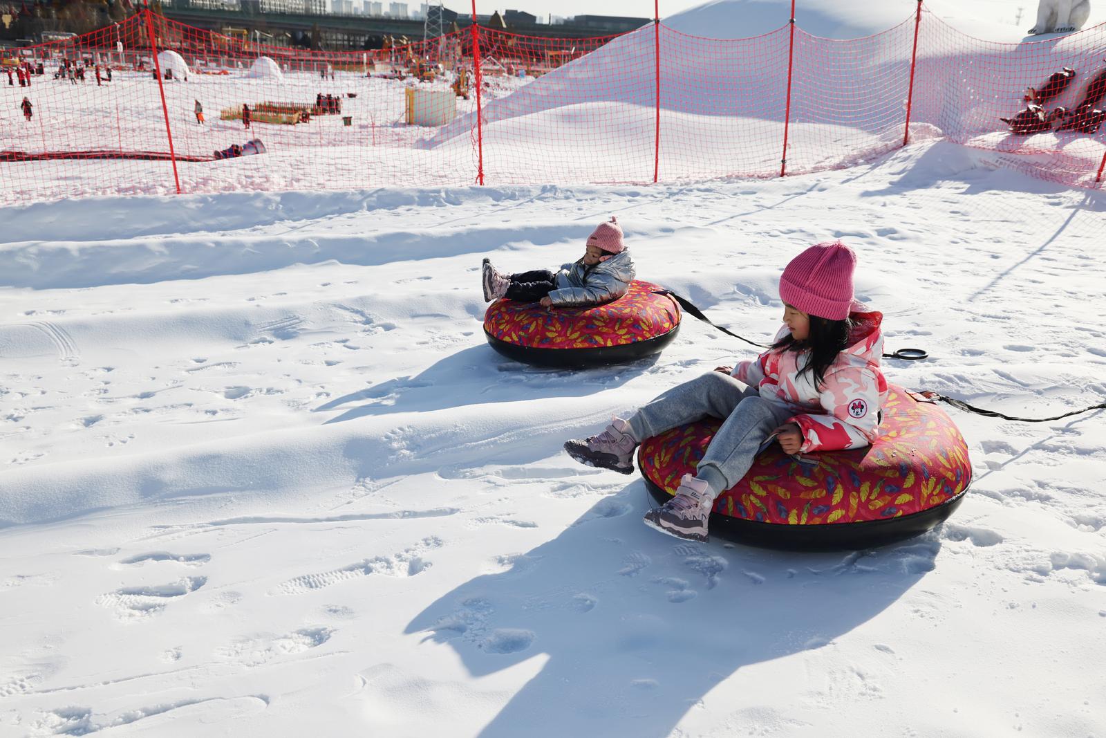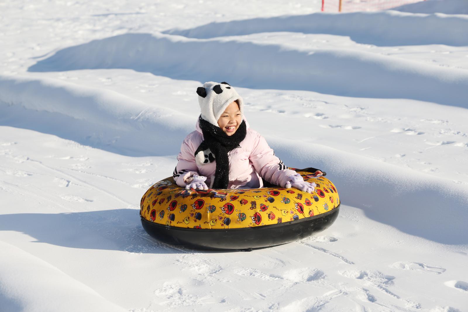 ▲乘坐雪圈,从雪滑梯上漂移而下