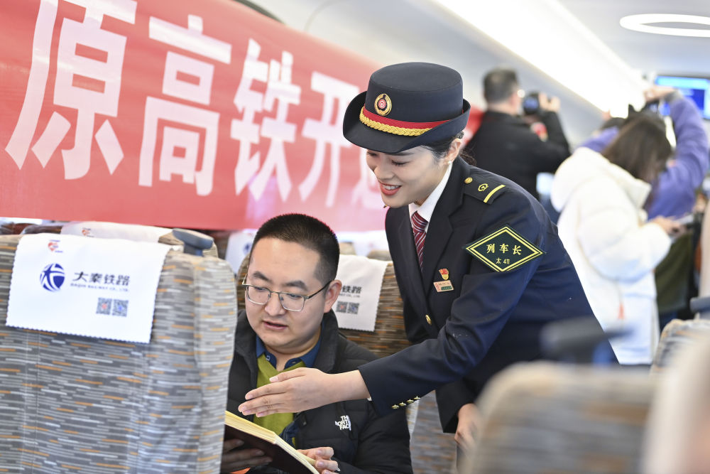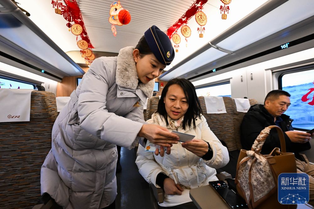 12月31日,在朔州东站开往呼和浩特东站的G4408次列车上,列车工作人员与乘客交流。