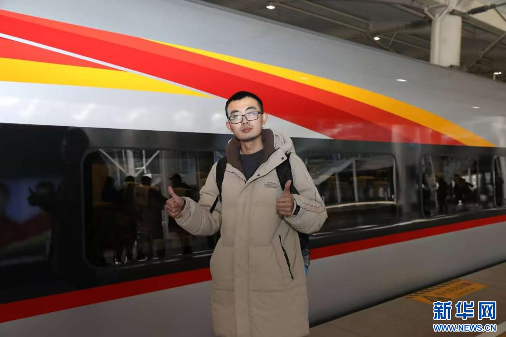 乘客在首发列车前留影。新华网发(陈慧忠 摄)