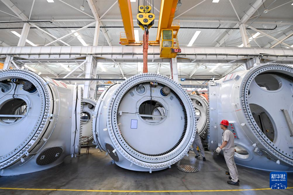 工人在位于山西转型综合改革示范区的太重集团新能源产业园区吊运风电装备(2024年5月30日摄)。新华社记者 杨晨光 摄