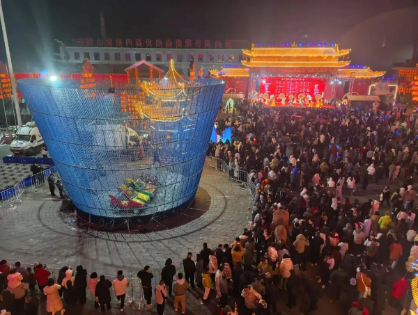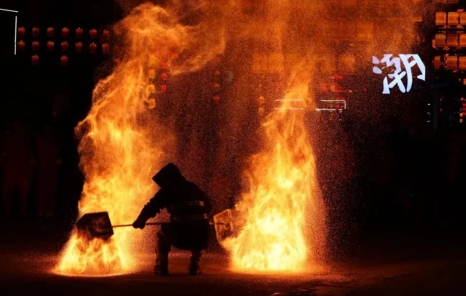 一群身穿古装的年轻人随着音乐的节拍起舞,处处皆是戏,热闹非凡。非遗大戏“打铁花”如约呈现,万千铁花冲破夜空尽情绽放,呈现非遗独有的浪漫。